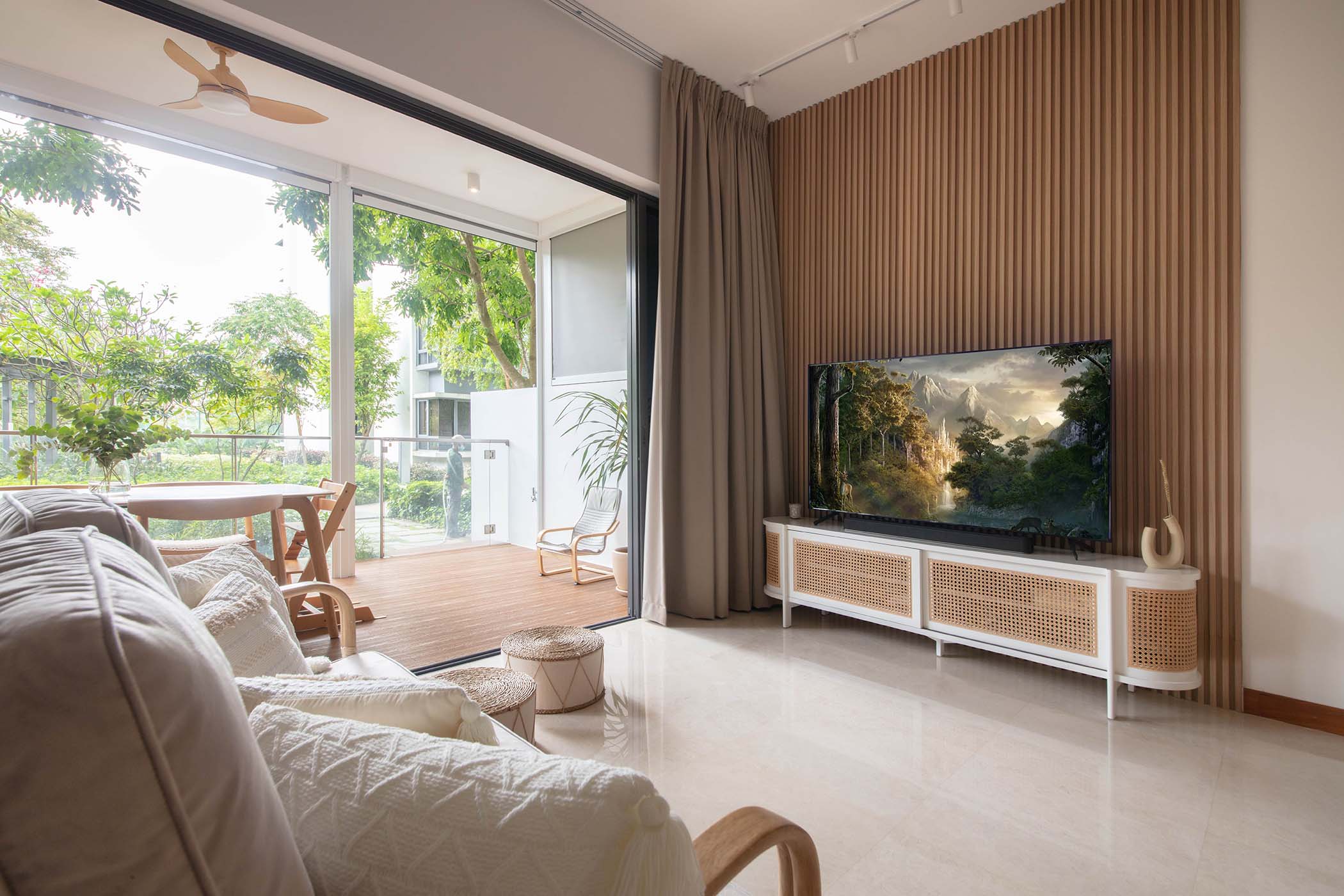 Award winning project. Hygge in Danish & Norwegian describes a mood of coziness & “comfortable conviviality” with feelings of wellness and contentment. Uchi in Japanese means interior. This home’s design is towards Japandi concept which is a combination of Japanese theme & Scandinavian. Colors are minimal, mainly white and light wood. However, trendy elements are added into the plain tones, such as fluted panels, curves to add the design touch to the minimal look. Rattans & Greens are also largely introduced in this space to combine the touch of nature into the design.