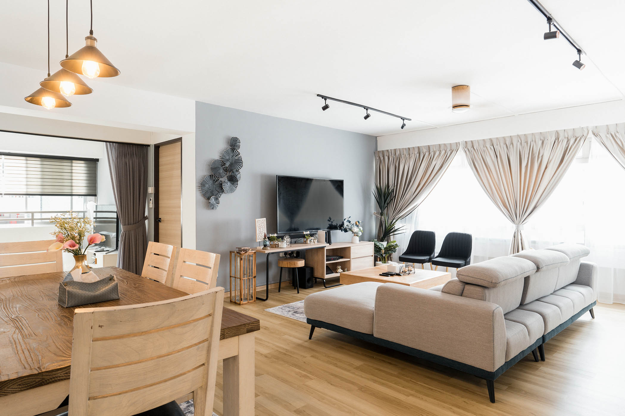 The theme of Modern industrial design involves open concept, simple and functional interiors. They are complemented by sustainable, cost-effective and trendy style. It can have a minimalist aesthetic, with clean lines and simple shapes. It often features exposed brick walls, metal accents, and Grey Flooring.