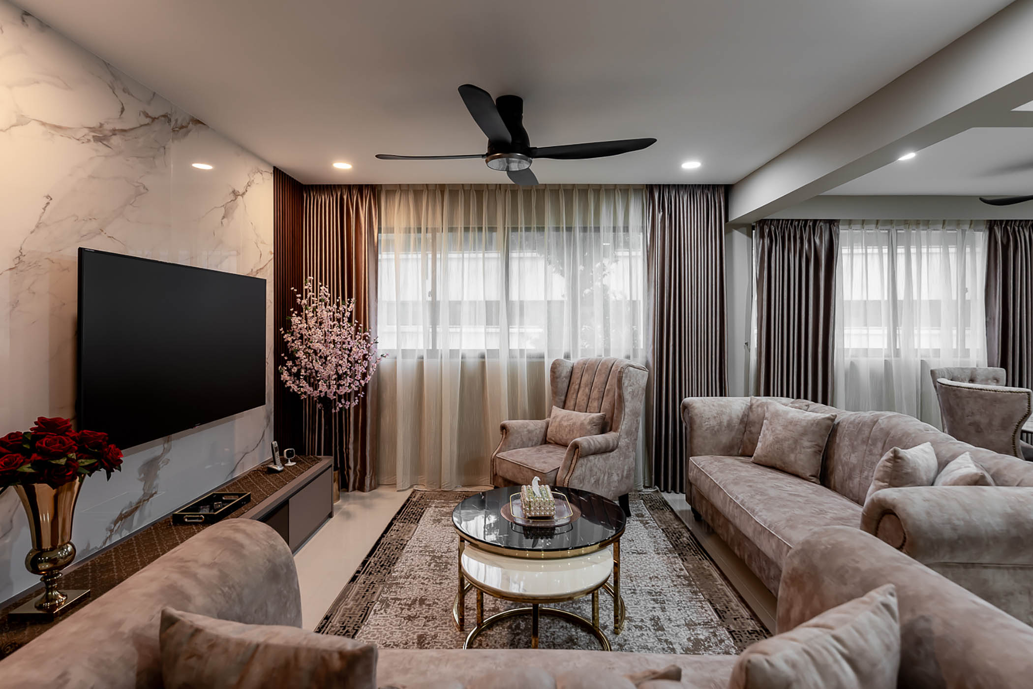 Immerse the space in a rich pink brown color scheme, customize the sofa with velvet material that evokes warmth, comfort, and intimacy, creating an artistic visual effect while maintaining practicality.