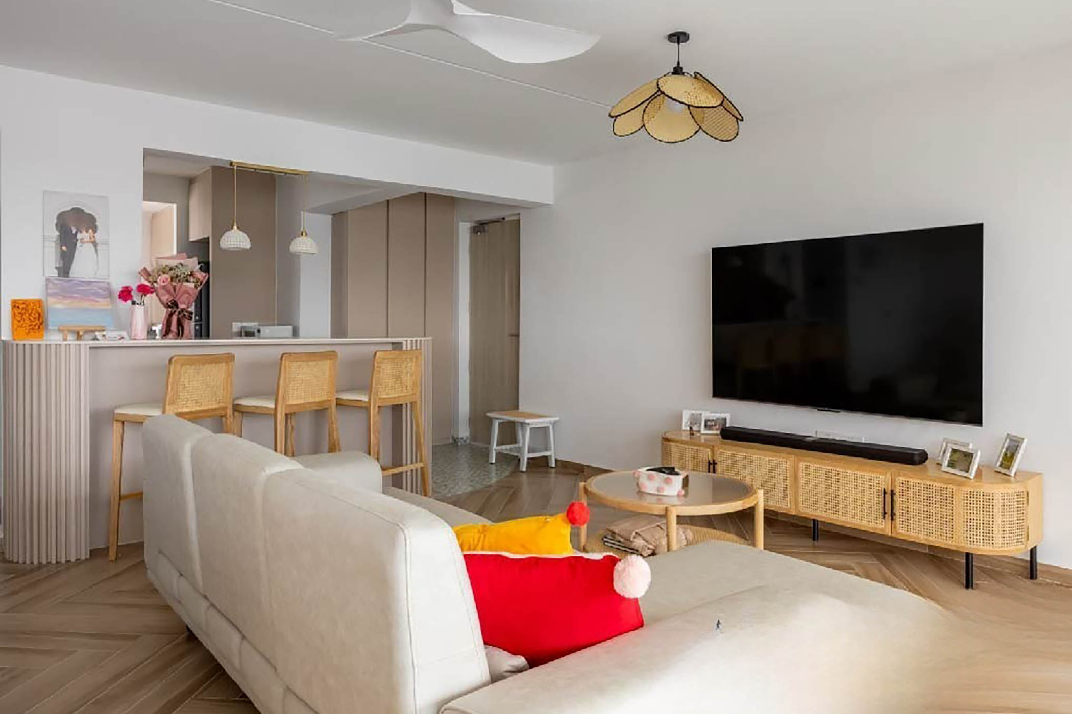 The design embraces clean lines, soft curves and a neutral colour palette to create a sense of openness throughout the home. Natural textures such as light wood finishes, fluted details and marble-inspired surfaces were introduced to add subtle visual interest without overwhelming the space. Thoughtfully integrated lighting and custom carpentry enhance both functionality and ambience, resulting in a serene home that reflects a refined yet cosy lifestyle.