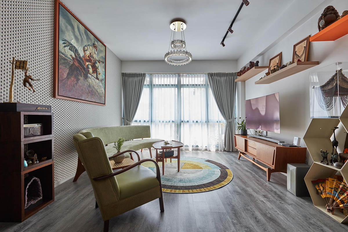 This carefully curated space seamlessly blends textures, patterns, and colours to create a truly captivating and unique ambiance. The walls and floors take centre stage, adorned with intricate patterns and textures that delight the eye with their attention to detail. The fusion of Scandinavian and Peranakan elements harmoniously coexists, resulting in a visual symphony that exudes character and style. A colourful palette is artfully employed, evoking a sense of nostalgia and playfulness. The Peranakan feel is brought to life through carefully chosen hues, adding a touch of whimsy and beauty to the space. Each colour is thoughtfully incorporated, creating a cohesive and visually stunning environment. Wooden furniture is selected throughout, further enhancing the design fusion. The natural warmth and elegance of wood infuse the space with a sense of comfort and timelessness. The bedrooms are rejuvenating sanctuaries, inviting you to relax and unwind. One of the bedrooms features a clever space-saving solution—a pulled down bed from the wall. This innovative design maximises functionality without compromising on style. The bathroom is a carefully designed retreat, incorporating Peranakan elements without sacrificing organisation or cleanliness. The Peranakan touches are tastefully integrated, creating a space that feels nostalgic yet effortlessly chic.