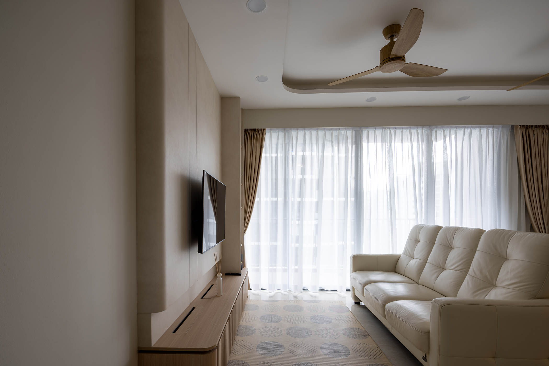Modern Japandi Condo | A Breath of Calm in Every Corner . The open-concept kitchen offers a seamless flow, providing flexibility for heavy cooking while maintaining the calming, minimalist aesthetic of the home. Watch how every corner of this sanctuary invites breathable calm when the foldable glass doors are kept open, effortlessly blending functionality with tranquility.